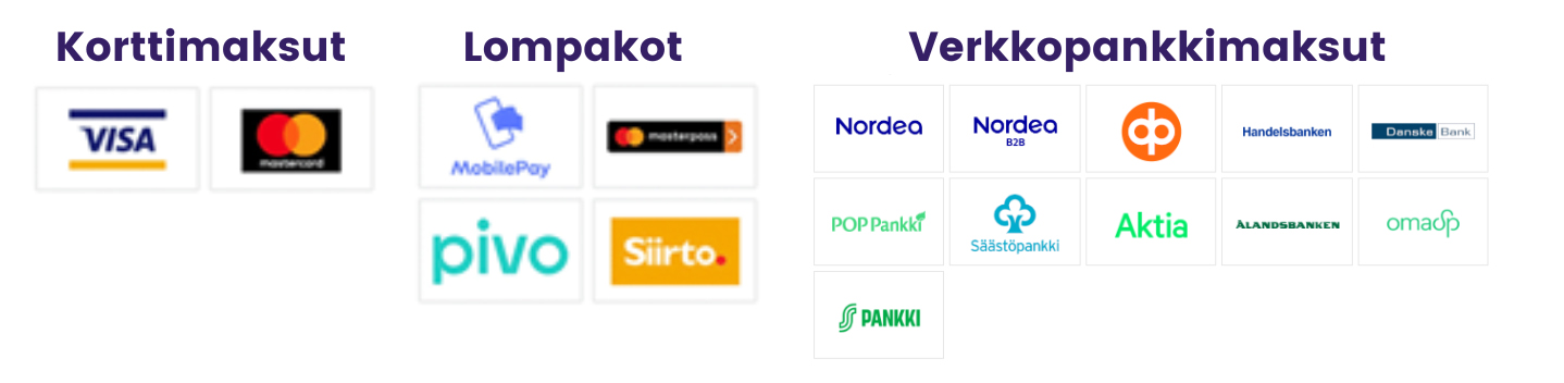 Käytössä verkko- ja mobiilimaksaminen, joihin löytyy linkit alapuolelta. Maksulinkin saa myös pyydettäessä omaan puhelimeen viestillä.